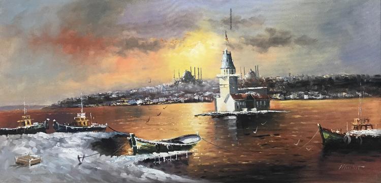 Halil Cankurt imzalı Kız Kulesi Gün Batımı Yağlıboya çalışması şasesiz rulo halinde gönderim sağlanacaktır.